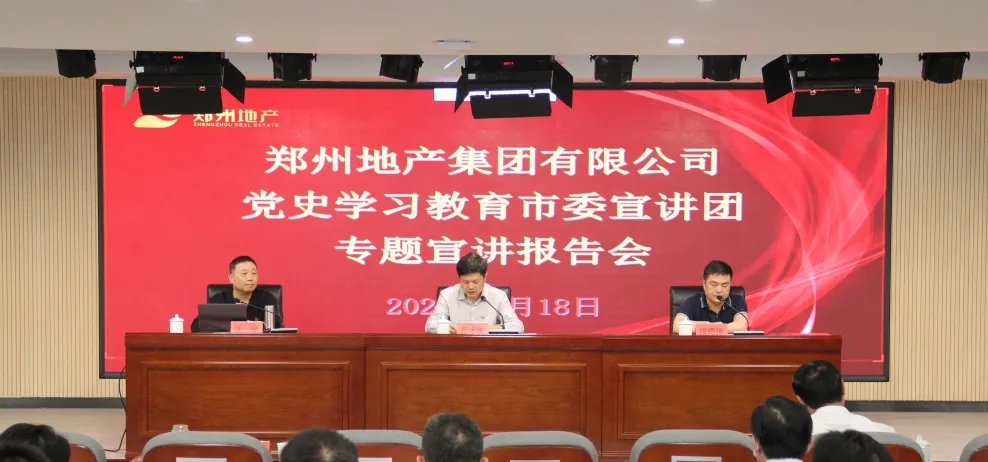 為持續(xù)推進(jìn)黨史學(xué)習(xí)教育走深走實(shí),5月18日上午,鄭州市委宣講團(tuán)走進(jìn)鄭州地產(chǎn)集團(tuán),在集團(tuán)301多功能廳開(kāi)展黨史學(xué)習(xí)教育專題宣講報(bào)告會(huì)。報(bào)告會(huì)由鄭州市委宣講團(tuán)成員、鄭州工程技術(shù)學(xué)院馬克思主義學(xué)院副教授張豪主講,市國(guó)資黨史學(xué)習(xí)教育第二巡回指導(dǎo)組組長(zhǎng)、四級(jí)調(diào)研員段德強(qiáng),指導(dǎo)組成員張?jiān)娪辍㈥愊殪车綍?huì)巡聽(tīng)旁聽(tīng),地產(chǎn)集團(tuán)領(lǐng)導(dǎo)班子、總部全體員工,各子公司支部書記、黨建部門負(fù)責(zé)人等共計(jì)150余人參加現(xiàn)場(chǎng)報(bào)告會(huì),各子公司員工共計(jì)170余人通過(guò)線上直播進(jìn)行觀看,會(huì)議由地產(chǎn)集團(tuán)黨委書記、董事長(zhǎng)萬(wàn)永生主持。