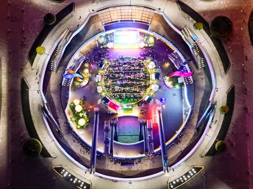 沿著夜市往里走,抬頭便是夜間燈光交織出的燈光秀,兩側(cè)則有璀璨彩燈編織的“萬千”星河。