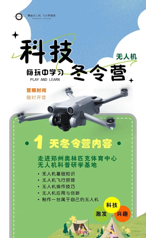 鄭州奧體翼能無(wú)人機(jī)研學(xué)基地是集無(wú)人機(jī)科普、研學(xué)、開(kāi)發(fā)、應(yīng)用、賽事運(yùn)營(yíng)的綜合服務(wù)平臺(tái),不僅擁有1000余平方米的無(wú)人機(jī)科普教育基地,還擁有無(wú)人機(jī)駕駛執(zhí)照的培訓(xùn)資格。寒假期間,依托鄭州奧體中心開(kāi)闊場(chǎng)館,翼能無(wú)人機(jī)將科普知識(shí)與實(shí)操表演完美結(jié)合,分別開(kāi)設(shè)1至5天不等的科技冬令營(yíng),代領(lǐng)孩子們放飛科技?jí)?,在嗨玩中學(xué)習(xí)。