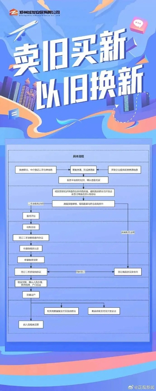 鄭州房產(chǎn)市場“賣舊買新、以舊換新”旨在滿足群眾改善性住房需求。具體來講,由政府指定收購主體—鄭州城市發(fā)展集團(tuán)有限公司與具有改善需求的換房群眾進(jìn)行洽談,通過價(jià)格評估、銀行貸款等一系列工作流程,收購群眾二手房源,為群眾購買新房提供資金支持,暢通買賣渠道。此外,群眾也可通過市場化方式進(jìn)行交易。