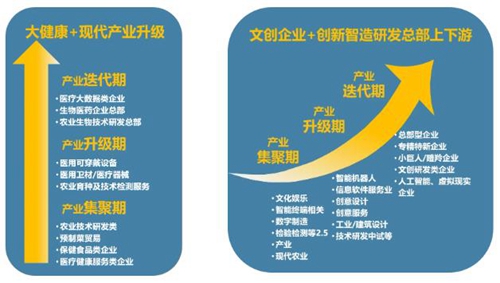 產(chǎn)業(yè)方面:以“大健康”+“文創(chuàng)娛樂”+“創(chuàng)新智造”為主導產(chǎn)業(yè),科技服務(wù)和創(chuàng)意研發(fā)為輔助產(chǎn)業(yè)。