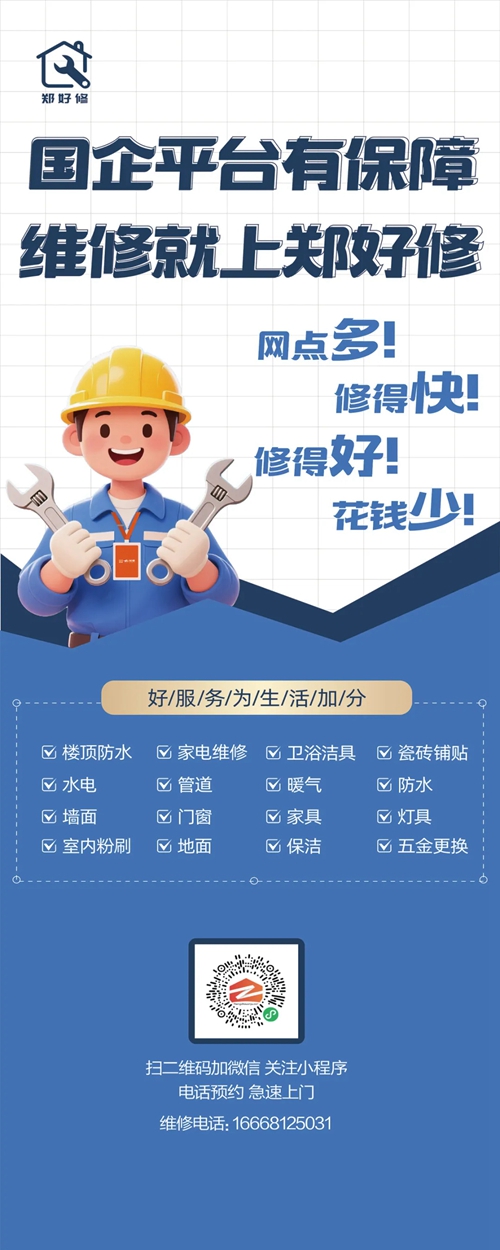 為切實(shí)解決群眾房屋維修難題,推動(dòng)鄭州市維修服務(wù)業(yè)邁向標(biāo)準(zhǔn)化、透明化、便捷化發(fā)展新征程,由鄭州城發(fā)集團(tuán)下屬子公司鄭州城發(fā)安居科技有限公司精心打造的“鄭好修”服務(wù)平臺(tái),正式上線運(yùn)營。市民通過鄭州安居微信小程序、鄭州安居微信服務(wù)號(hào),即可輕松實(shí)現(xiàn)一鍵報(bào)修,享受優(yōu)質(zhì)高效的房屋維修服務(wù)。
