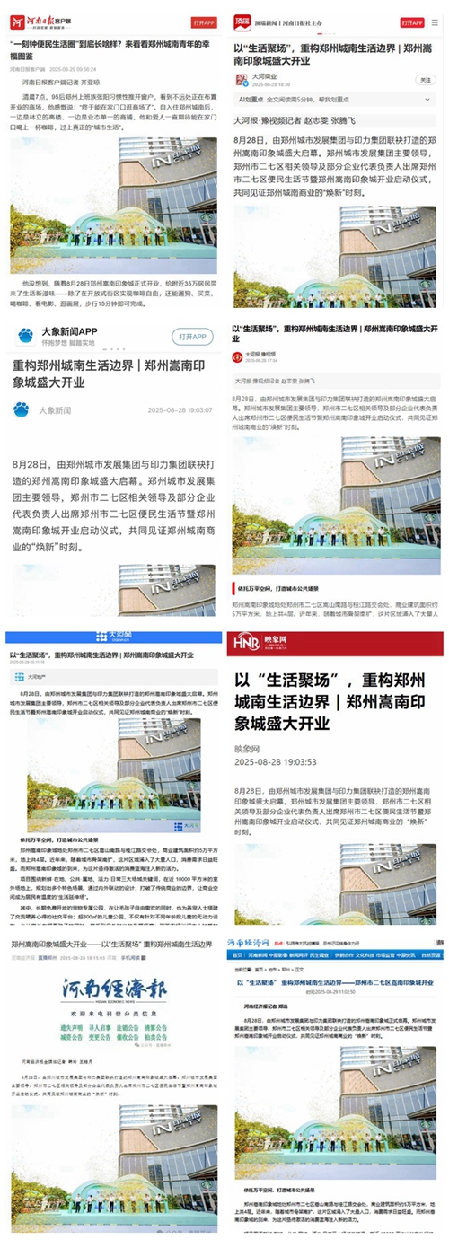 8月28日,鄭州城南商業(yè)格局迎來重大變革,由鄭州城市發(fā)展集團與印力集團攜手打造的鄭州嵩南印象城盛大啟幕,開業(yè)首日客流達12.6萬人次,迅速成為全城矚目的焦點。這一盛事引發(fā)了各大媒體的廣泛關(guān)注,河南日報客戶端、頂端新聞、大象新聞、大河報、大河網(wǎng)、映象網(wǎng)、河南經(jīng)濟報、鄭州日報、鄭州晚報、鄭州廣播電視臺等媒體紛紛聚焦,對其開業(yè)進行了全方位、多角度的報道。