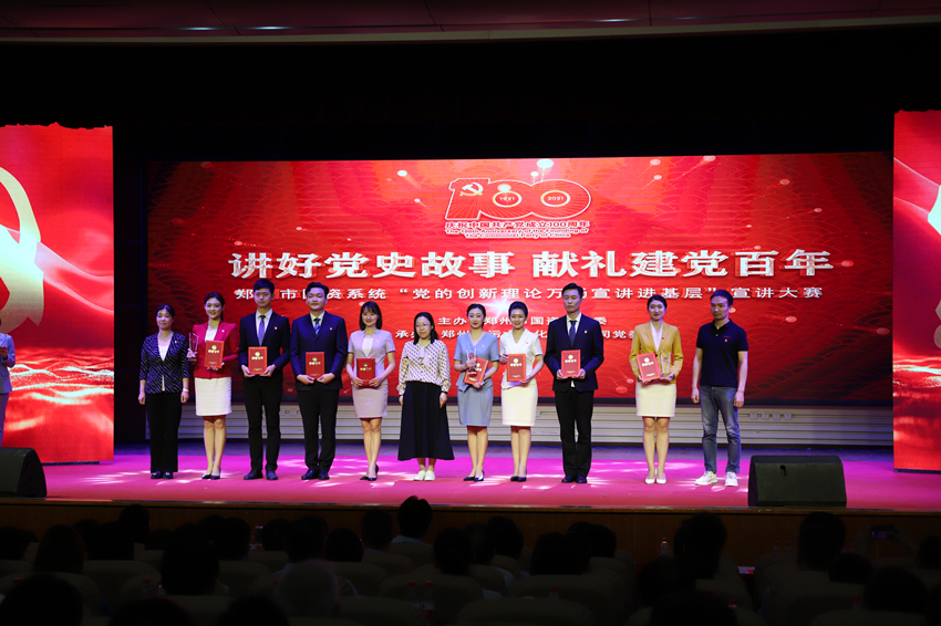 為慶祝中國(guó)共產(chǎn)黨成立100周年, 扎實(shí)開(kāi)展黨史學(xué)習(xí)教育, 5月26日上午,鄭州市國(guó)資系統(tǒng)“講好黨史故事·獻(xiàn)禮建黨百年”——“黨的創(chuàng)新理論萬(wàn)場(chǎng)宣講進(jìn)基層”宣講大賽在市總工會(huì)一樓職工大禮堂圓滿落下帷幕。來(lái)自市國(guó)資系統(tǒng)14家單位選送的15個(gè)宣講節(jié)目進(jìn)入大賽決賽,鄭州地產(chǎn)集團(tuán)選送的西流湖公司黨支部宣講節(jié)目《百年交響》榮獲三等獎(jiǎng)。