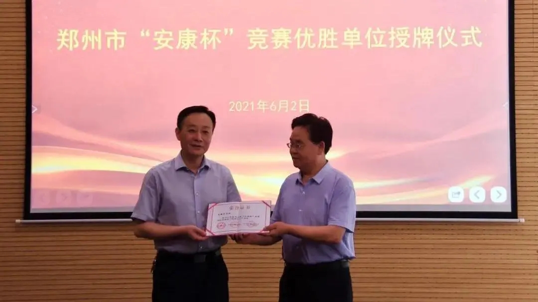 6月2日下午,鄭州市總工會機(jī)關(guān)工會主任王銀倉、市總工會勞動和經(jīng)濟(jì)部部長宋慧分別向集團(tuán)兩家獲獎公司頒發(fā)鄭州市“安康杯”競賽優(yōu)勝單位獎牌。